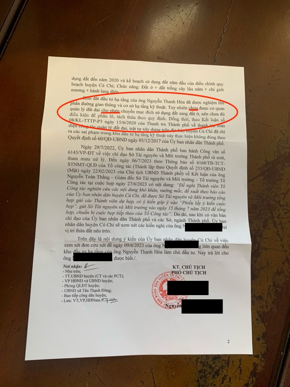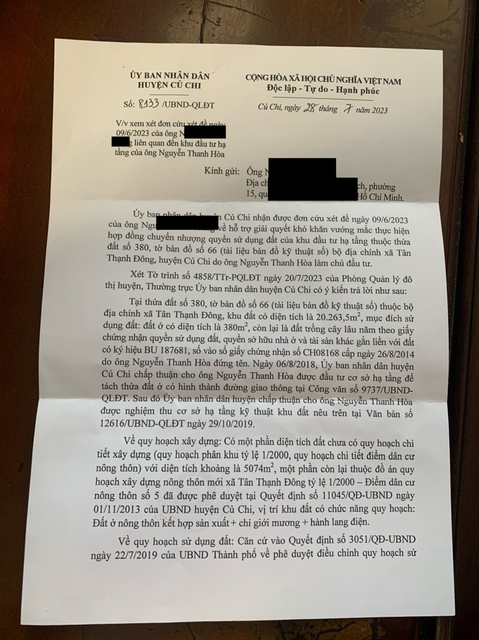 Người mua đất đính kèm thư trả lời của Ủy ban nhân dân huyện Củ Chi về việc phân lô bán nền Residence 1: