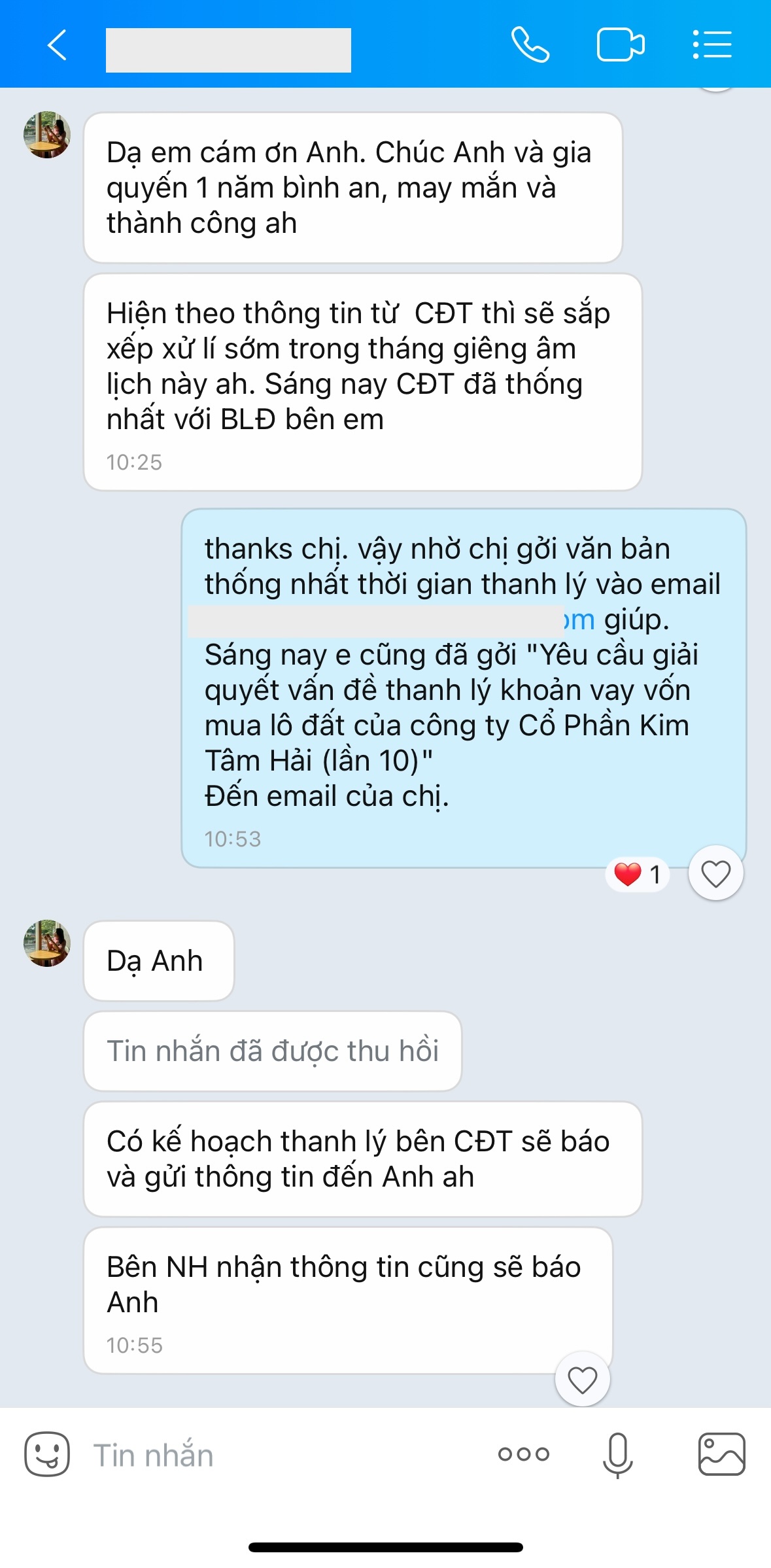 Vào ngày 19 tháng 02 năm 2024, tôi được nhân viên tên Khuất Lê Diệp Quỳnh, giới thiệu là Trưởng phòng Khách hàng cá nhân Ngân hàng TMCP Nam Á - Chi nhánh Lý Thường Kiệt, liên hệ qua Zalo và thông báo với tôi thời gian thanh lý trong tháng Giêng âm lịch: