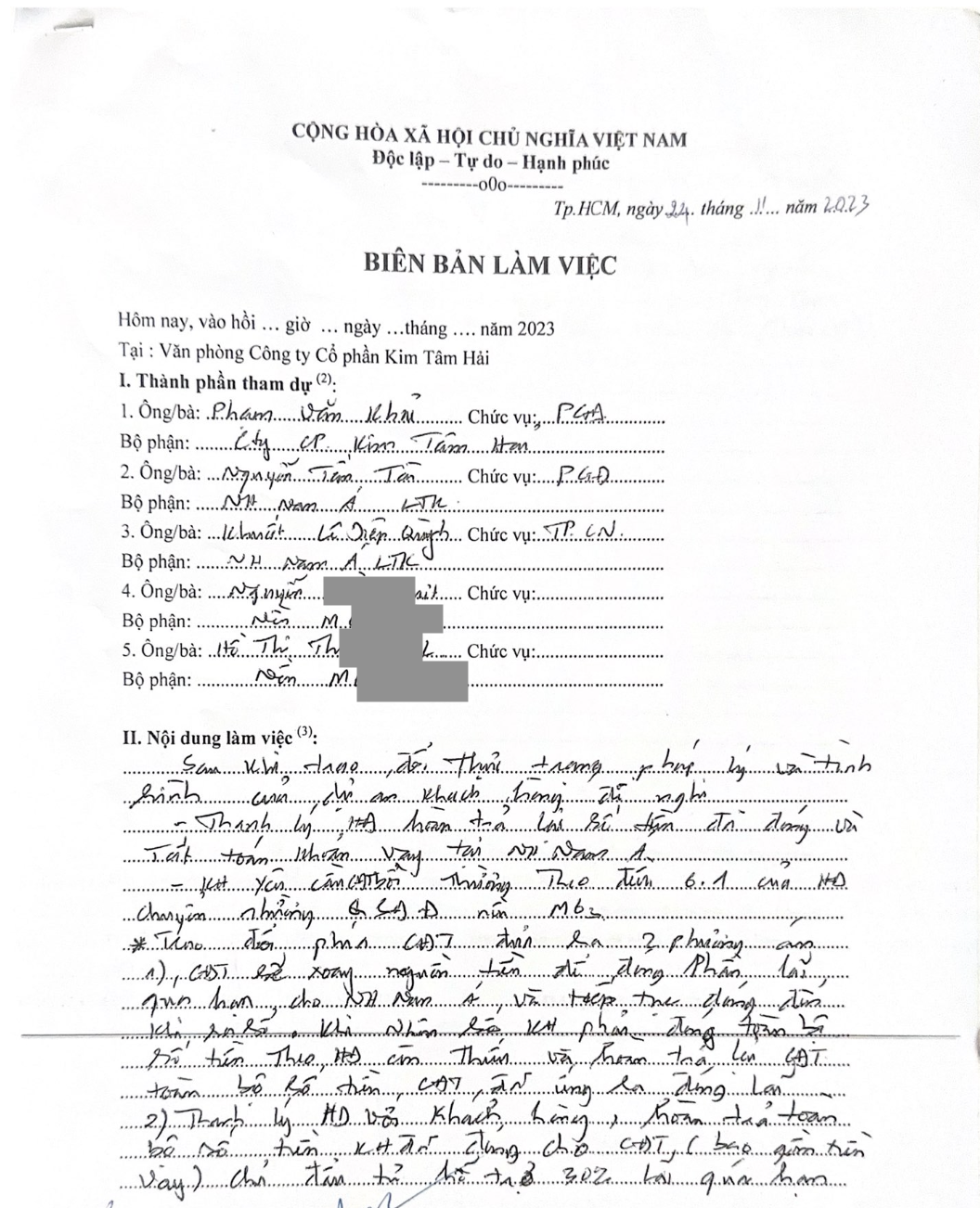 Theo biên bản làm việc 3 bên hồi 14 giờ ngày 24 tháng 11 năm 2023, có sự tham gia của ông Nguyễn Tấn Tài - Phó Giám đốc chi nhánh Lý Thường Kiệt và ông Phạm Văn Khải - Phó Giám đốc công ty Cổ Phần Kim Tâm Hải, đã thống nhất thời gian thanh lý hợp đồng dự kiến trong tháng 11 năm 2023.