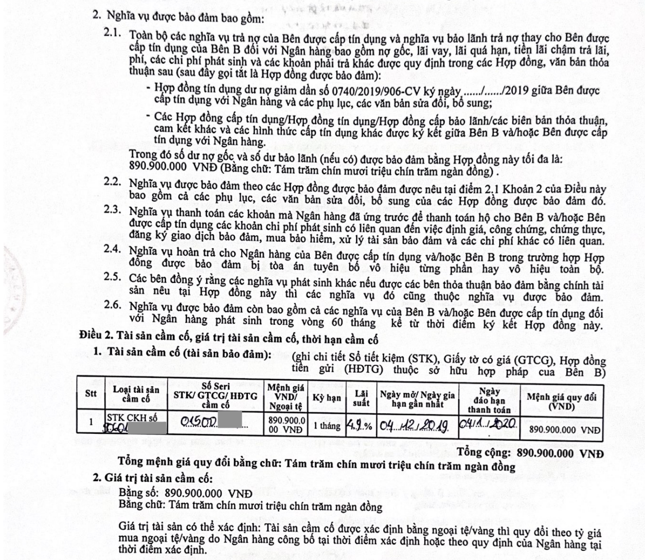 Tôi cũng xin lưu ý rằng, căn cứ Hợp đồng cầm cố tài sản số 0378/2019/906-BĐ ngày 04/12/2019, Chủ đầu tư cũng đã cam kết dùng các số tiết kiệm có giá trị để bảo đảm cho nghĩa vụ trả nợ của tôi liên quan đến việc vay vốn tại ngân hàng: